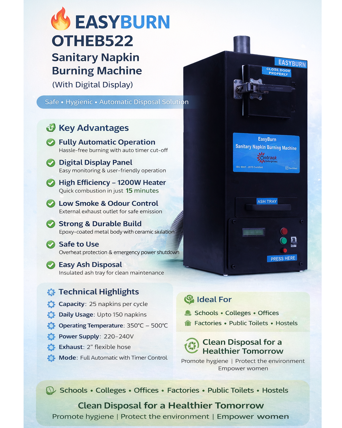 EASYBURN OTHEB522 is a fully automatic sanitary napkin burning machine designed to provide a safe, hygienic, and eco-friendly disposal solution for used sanitary napkins. Built with advanced safety features and a digital display panel, this machine ensures efficient combustion with minimal smoke and odor, making it ideal for public and institutional use.