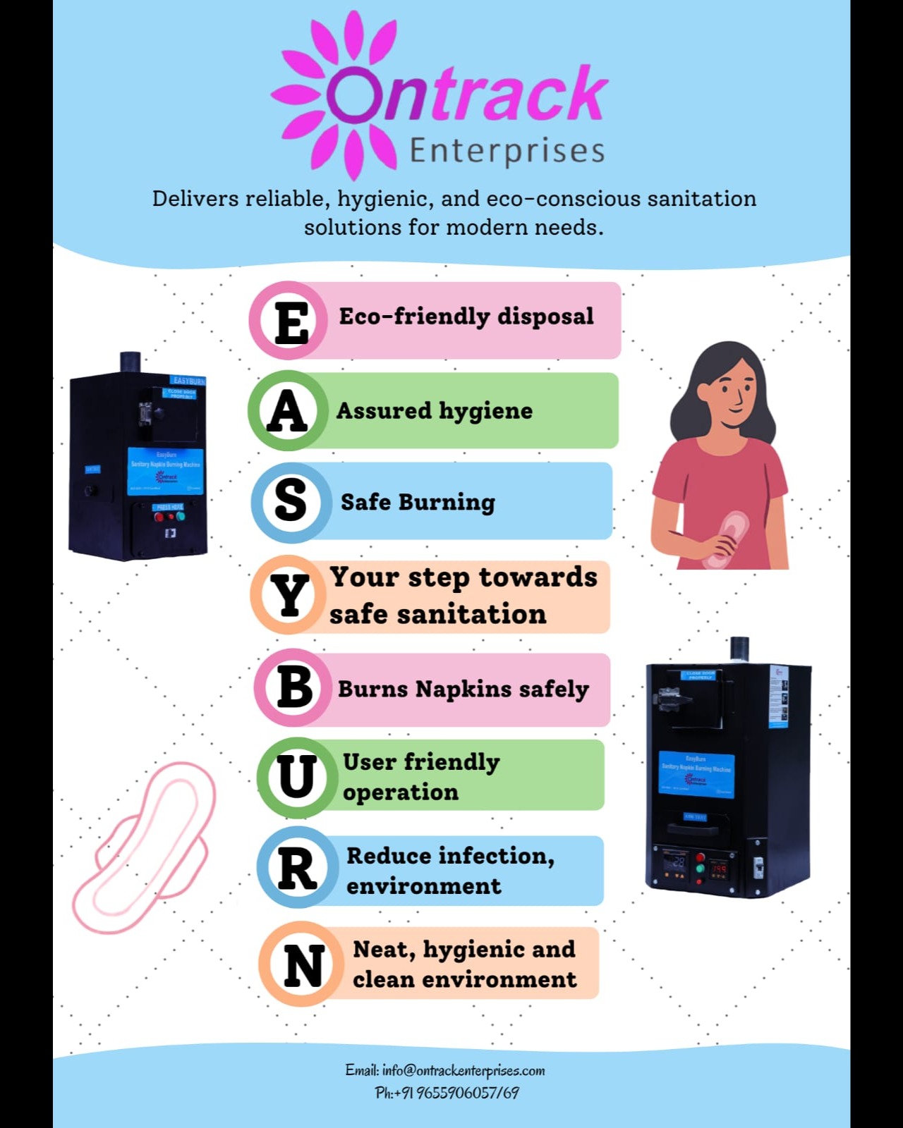 Ontrack Enterprises is a leading manufacturer and supplier of Smart and EASYBURN sanitary napkin destroyers in Chennai, delivering safe, hygienic, and eco-friendly solutions for sanitary waste disposal. Our advanced napkin destroyers are designed with smoke-controlled burning technology, user-friendly operation, and reliable performance, making them ideal for schools, colleges, offices, hospitals, factories, and public facilities. Committed to quality, innovation, and dignity in hygiene, Ontrack Enterprises ensures efficient disposal, reduced infection risk, and environmentally responsible waste management across all installations.