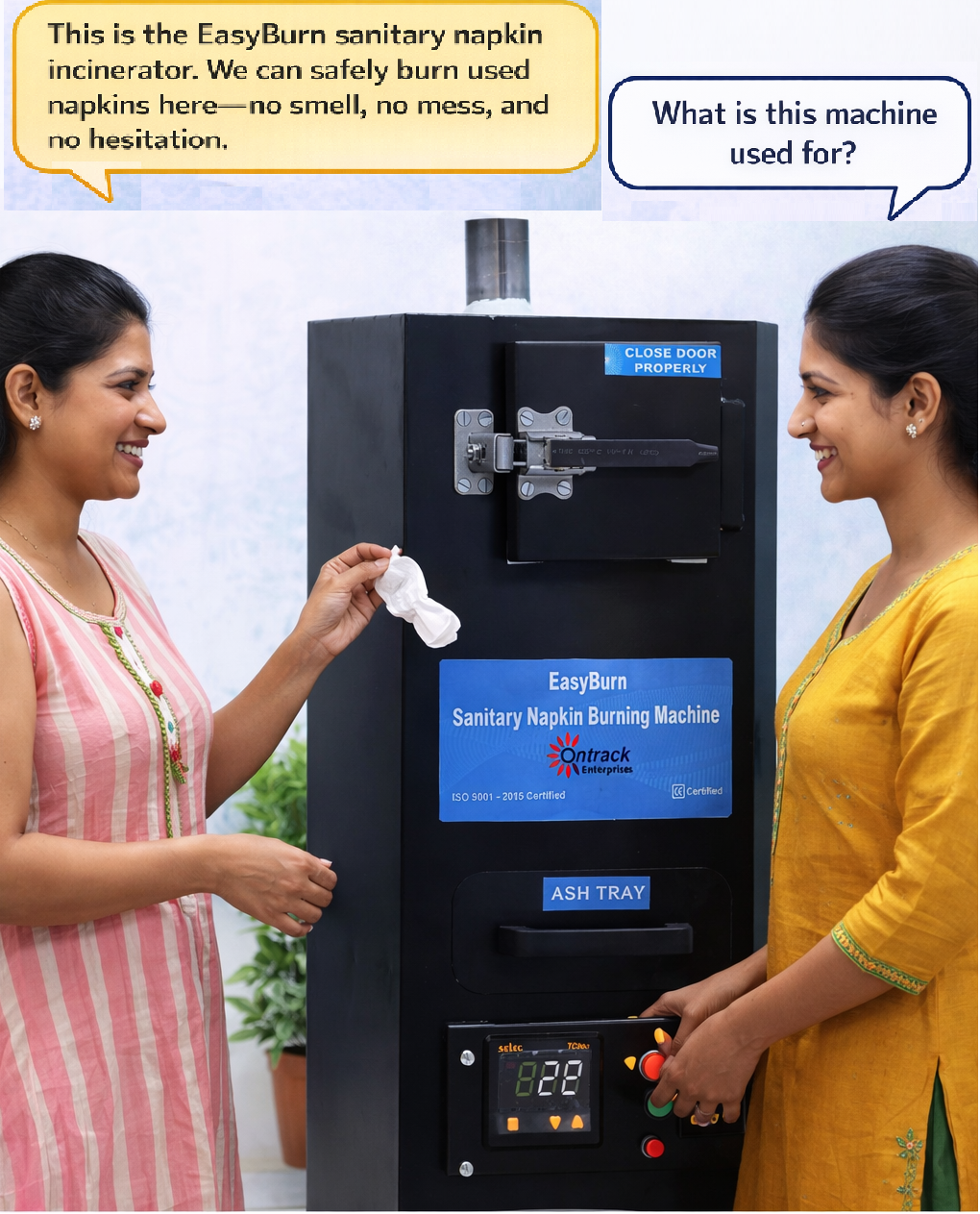 The EasyBurn Sanitary Napkin Incinerator by Ontrack Enterprises offers a simple, safe, and eco-friendly solution for disposing of used sanitary napkins. Designed for schools, colleges, offices, hospitals, and public restrooms, EasyBurn ensures odor-free, smoke-controlled, and hygienic incineration-helping maintain cleanliness and dignity without hesitation.