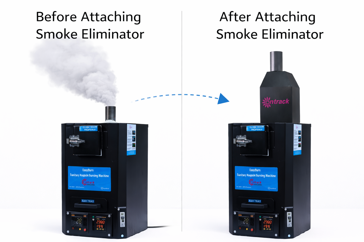 The Smoke Eliminator by Ontrack Enterprises is an advanced pollution-control attachment designed to eliminate visible smoke, ash particles, and odour generated during sanitary napkin burning. When connected to the incinerator, it ensures cleaner exhaust air and a safer environment, making it ideal for schools, colleges, offices, factories, hospitals, and public facilities. The system captures smoke particles, fine ash dust, and suspended matter before releasing the exhaust air. This significantly reduces visible smoke emission and improves overall air quality around the installation area.